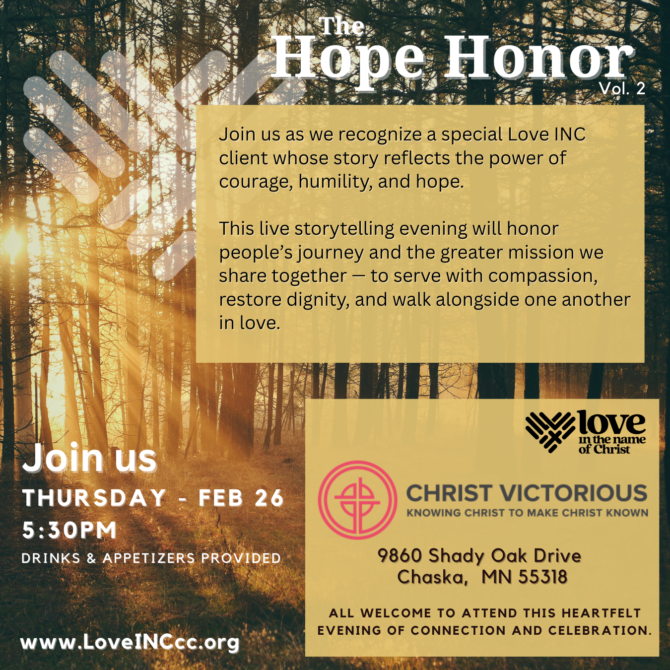 The Hope Honor is a heart-centered gathering where we come together to celebrate hope, honor a real story of impact through Love INC and learn more about our mission here in Carver County. Expect an uplifting evening of connection, meaningful moments, and a chance to feel the impact—because when we show up for one another, love moves.